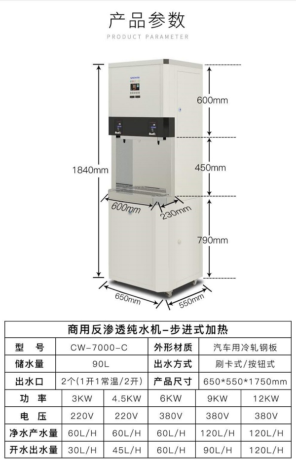 世韩商用净水机CW-7000C 采用目前世界上先进的反渗透技术,反渗透膜是一种采用压力驱动使得水分子反向进行渗透作用的分离膜,由于其表面孔径约0.0001微米(或0.1纳米),因此可有效去除水中的细微杂质、可溶解盐类、有机物、重金属离子、微生物、病毒、农药或残留物等有害物质,仅保留了水分子和溶解氧,所制造的纯水甘甜可口,可直接生饮。